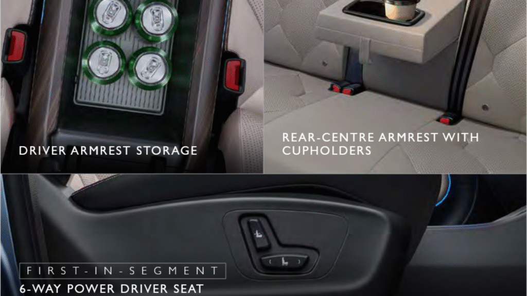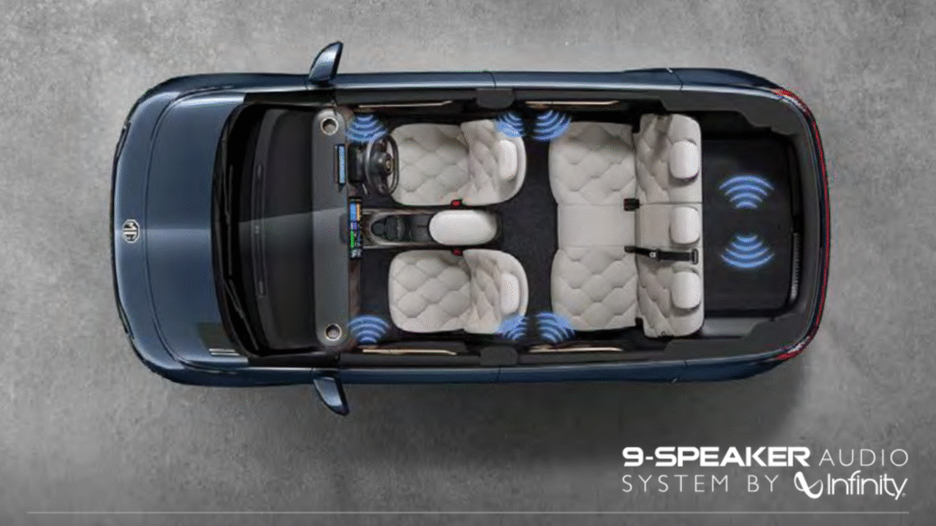The Windsor EV is well-equipped with modern tech and comfort features. Its centerpiece is the 15.6-inch central touchscreen, which runs MG’s iSmart infotainment system (with navigation, smartphone mirroring, voice control and over-the-air updates). Other convenience features include a 9-speaker Infinity premium audio system, wireless phone charging, and automatic dual-zone climate control. Ambient interior lighting (256 colors) adds a premium feel. The car has ventilated front seats and rear AC vents for passenger comfort. The powered tailgate (on top trims) and a spacious glovebox and storage bins add practicality.